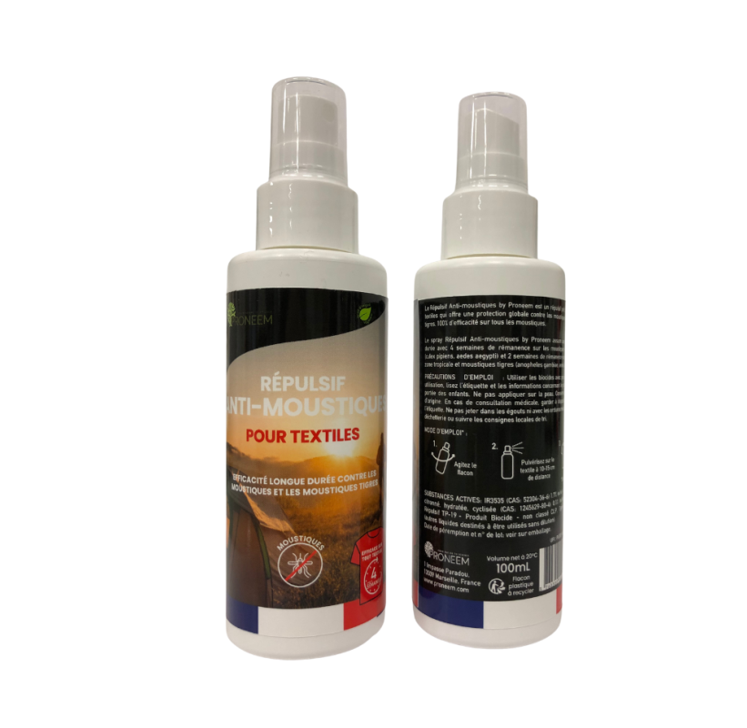 Proneem a développé un traitement répulsif biosourcé, formulé à partir d’extraits naturels reconnus pour leur efficacité. Ces solutions respectent les recommandations de l’Organisation Mondiale de la Santé et offrent une protection optimale contre les insectes vecteurs de maladies. Une réponse sûre et durable pour préserver la santé des utilisateurs