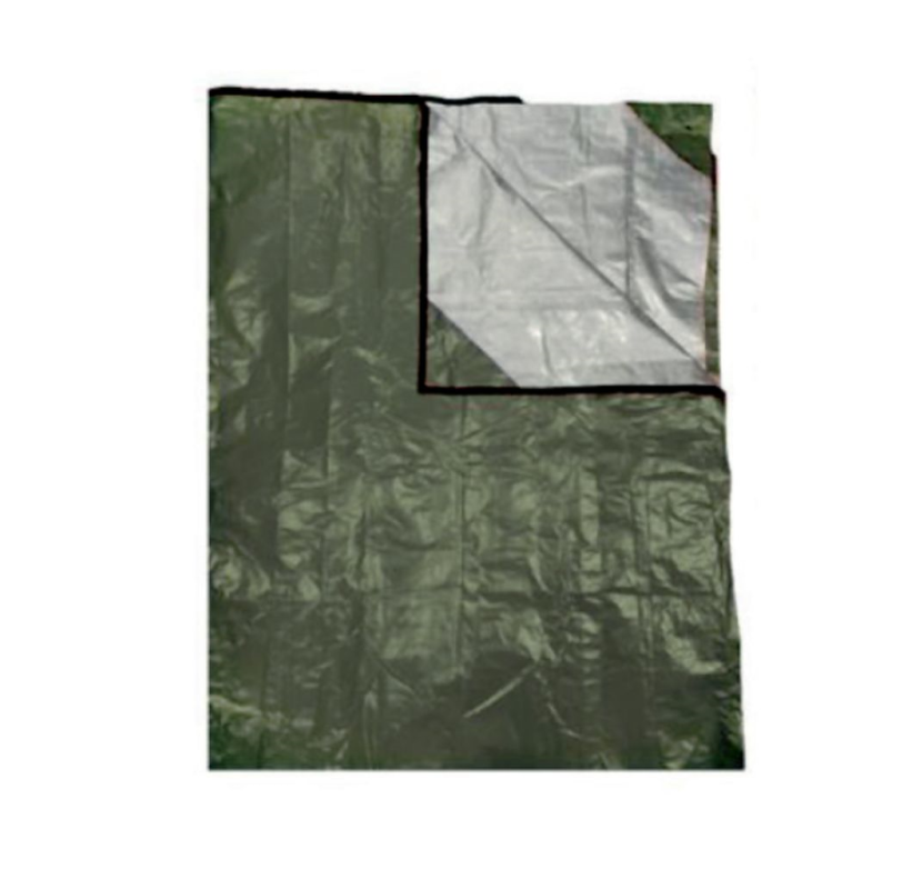 Une grand couverture de survie en polypropylène solide, légère et laminée avec 4 œillets en laiton pour accrocher une corde et l'utiliser en abri de secours ou tarp.